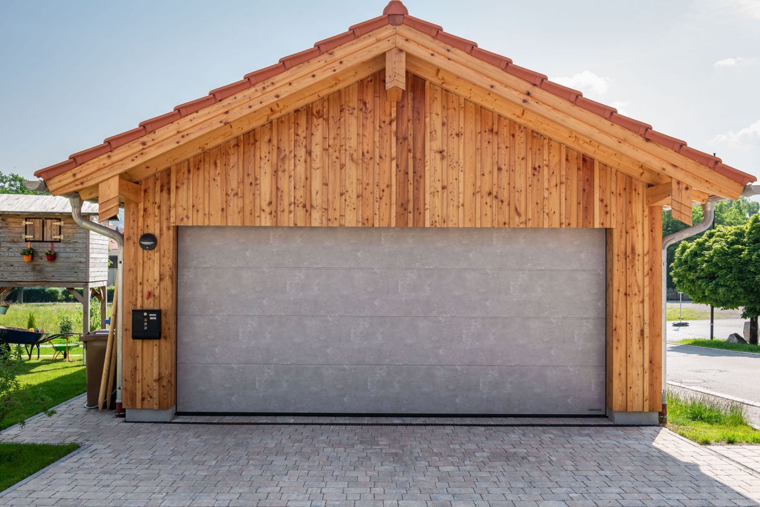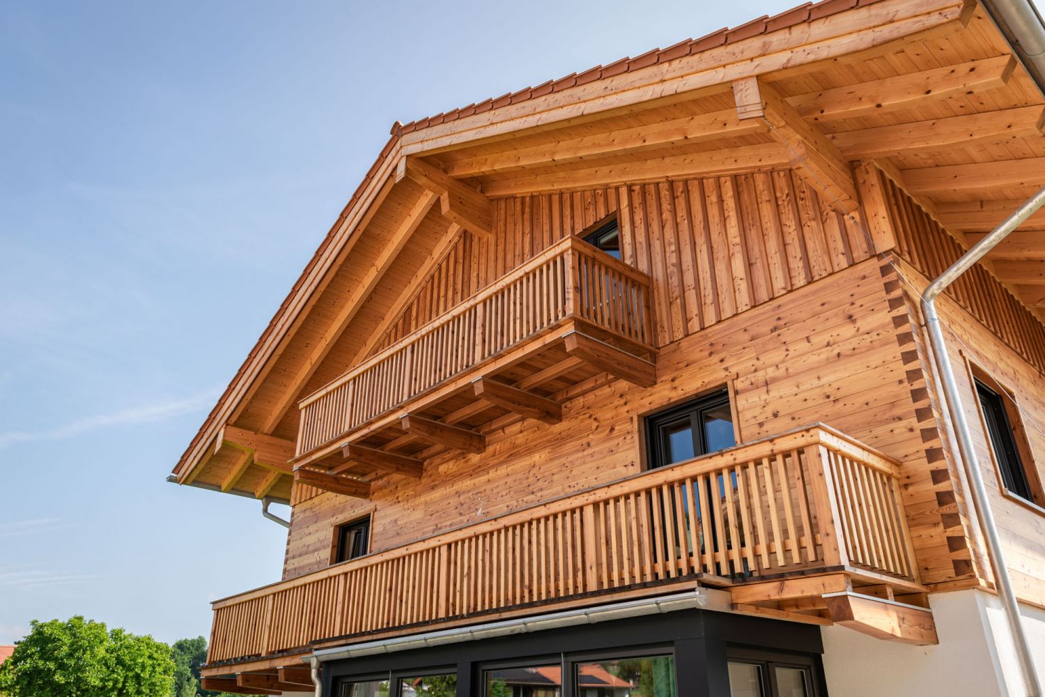 Diese moderne Doppelhaus wurde in Holzständerbauweise errichtet und mit einer robusten Brettsperrholzdecke ausgestattet. Die Außenwände erhielten eine natürliche Blockwandschalung aus Lärche, die dem Gebäude eine warme, zeitlose Ausstrahlung verleiht. Der Wintergarten erweitert den Wohnraum, während die PV-Anlage die nachhaltige Nutzung regenerativer Energien ermöglicht.