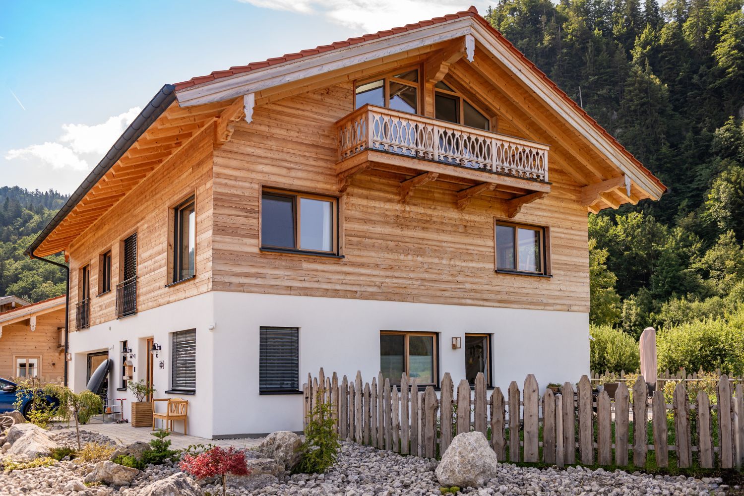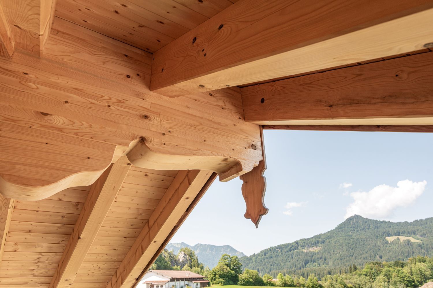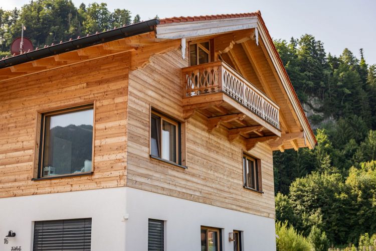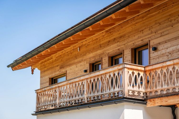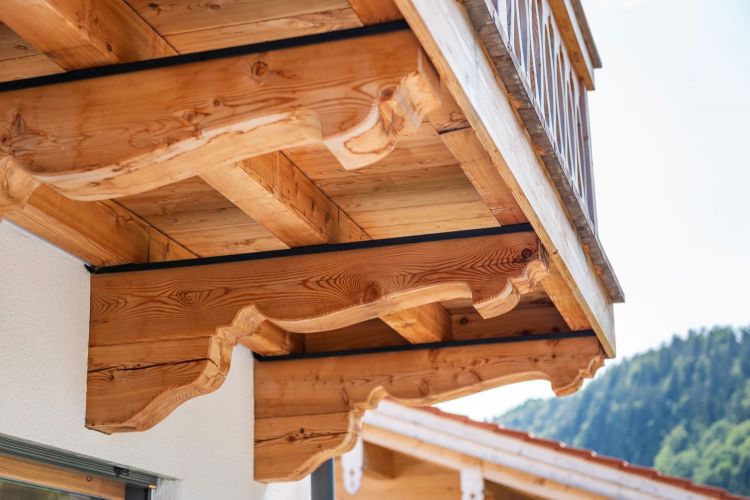 Für dieses Einfamilienhaus haben wir mit viel Liebe zum Detail einen Dachstuhl mit profilierten Pfettenköpfen gebaut und eine hochwertige Lärchenschalung in verschiedenen Breiten montiert. Der Balkon, ebenfalls in Lärche, wurde mit kunstvoll gefrästen Zierbrettern veredelt – jedes Element trägt zur einzigartigen Atmosphäre dieses Hauses bei und fügt sich harmonisch in das Gesamtbild ein.