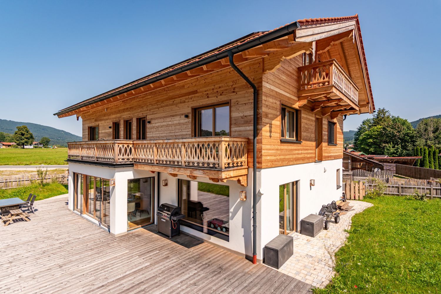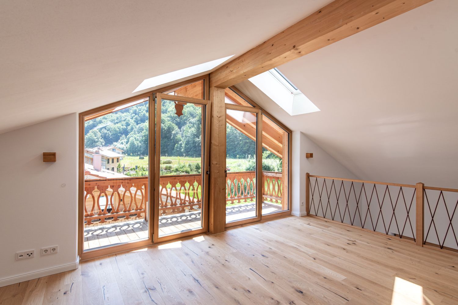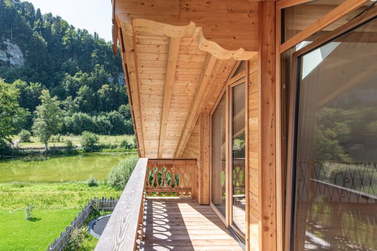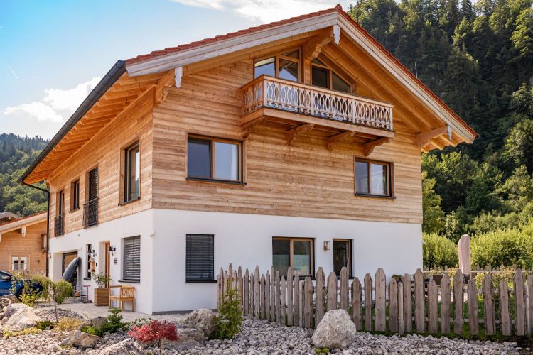 Für dieses Einfamilienhaus haben wir mit viel Liebe zum Detail einen Dachstuhl mit profilierten Pfettenköpfen gebaut und eine hochwertige Lärchenschalung in verschiedenen Breiten montiert. Der Balkon, ebenfalls in Lärche, wurde mit kunstvoll gefrästen Zierbrettern veredelt – jedes Element trägt zur einzigartigen Atmosphäre dieses Hauses bei und fügt sich harmonisch in das Gesamtbild ein.