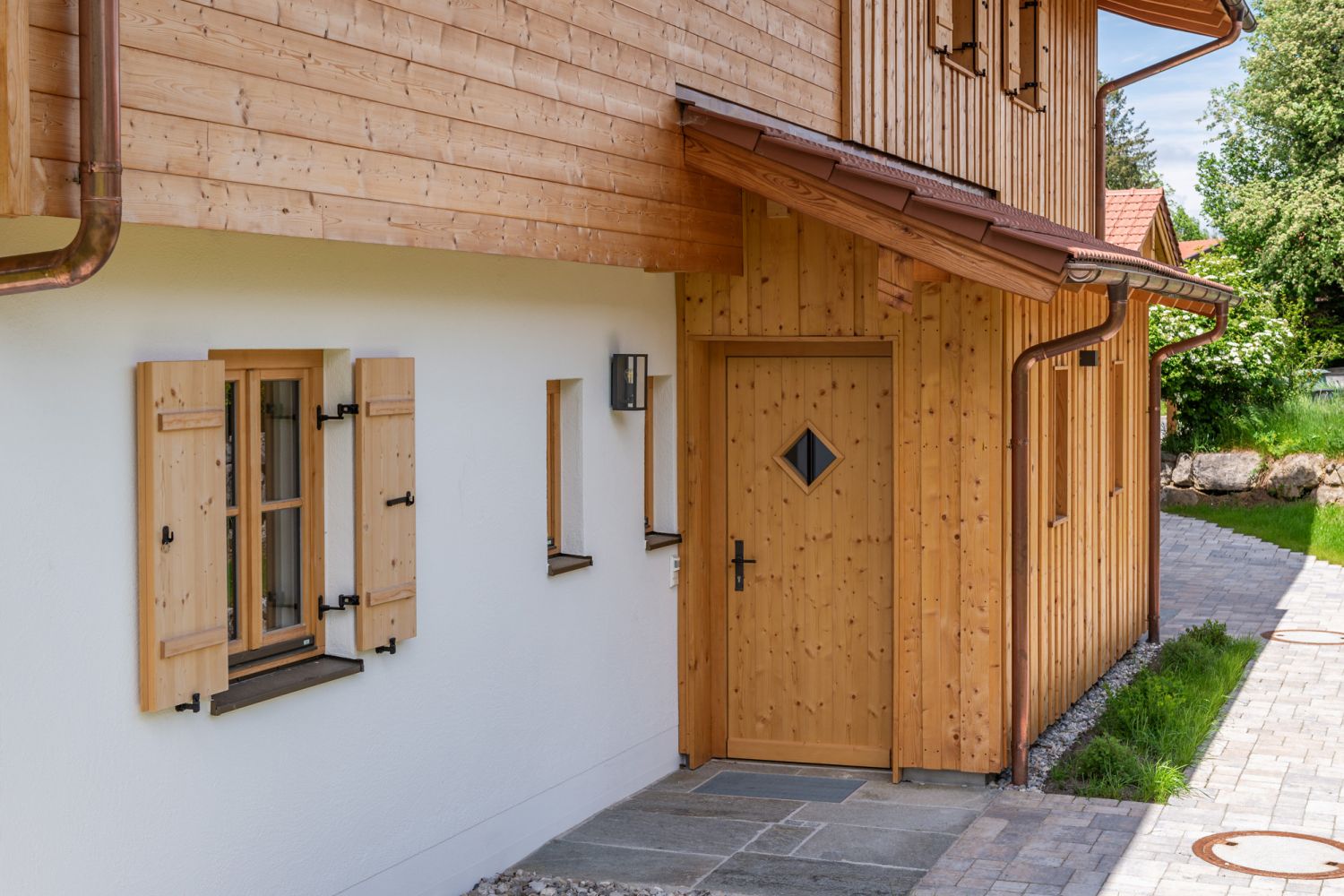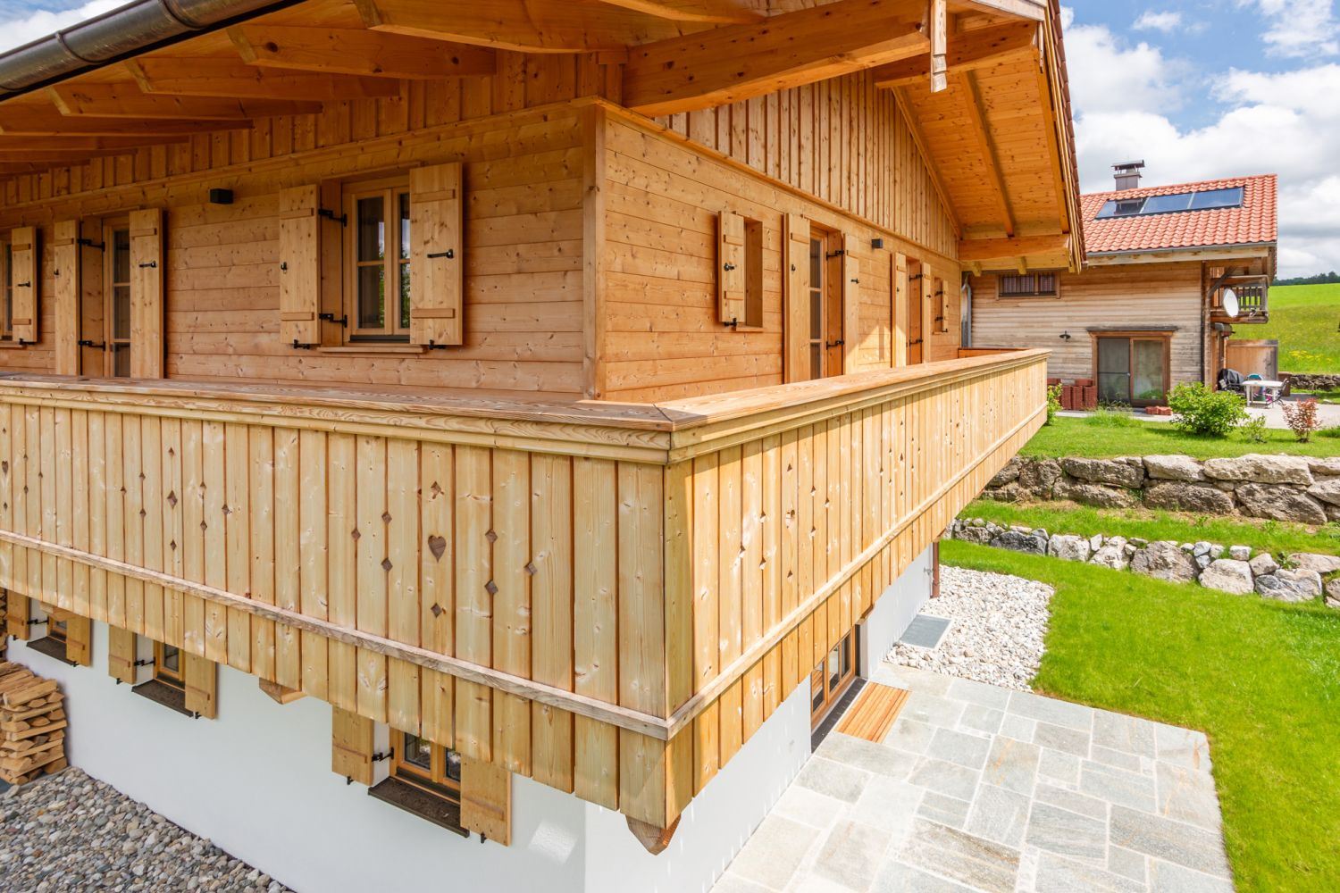 Bei diesem Doppelhaus-Projekt wurde der Dachstuhl des Hauses und die Garage mit Carport in klassischer Holzbauweise gefertigt. Eine Haushälfte ist mit Deckleistenschalung versehen, die andere mit waagrechter Nut- und Federschalung in Fichte. Die Balkone sind komplett aus Lärchenholz gestaltet.
