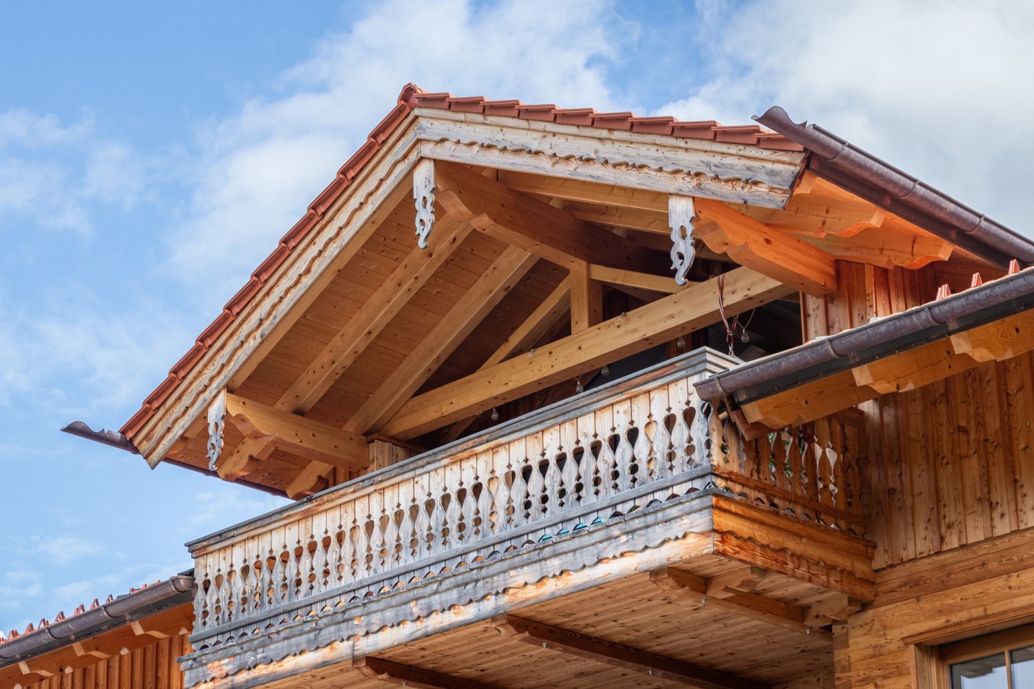 Hier wurden von uns klassische Holzbauarbeiten ausgeführt: rauer Dachstuhl mit Zwischensparrendämmung (Einblasdämmung), Satteldachgaube, Dachstuhl für Anbau, profilierte Sparrenköpfe, Windfang- und Pfettenbretter. Außenschalung in gebürsteter Lärche im OG, Leistenschalung in Lärche im DG, Balkone in Lärche.