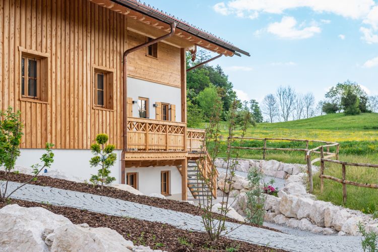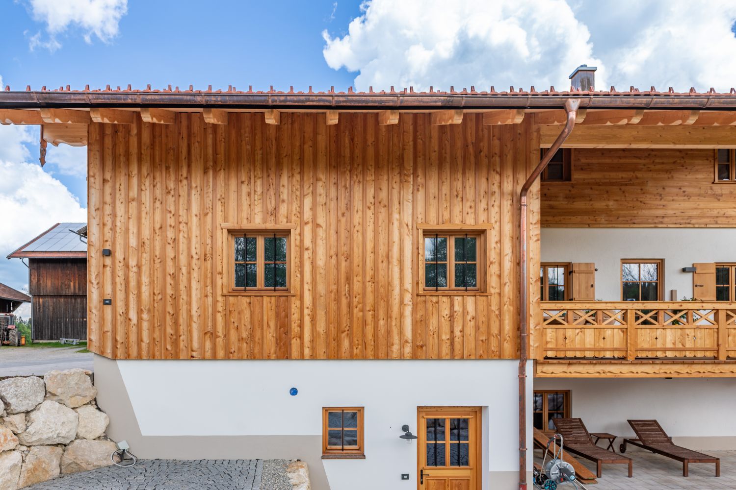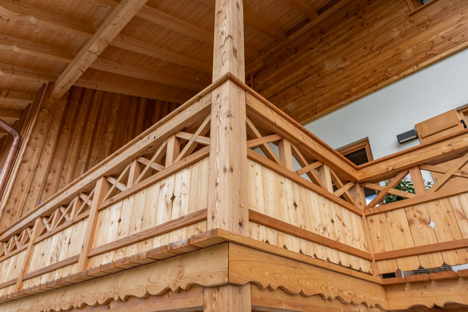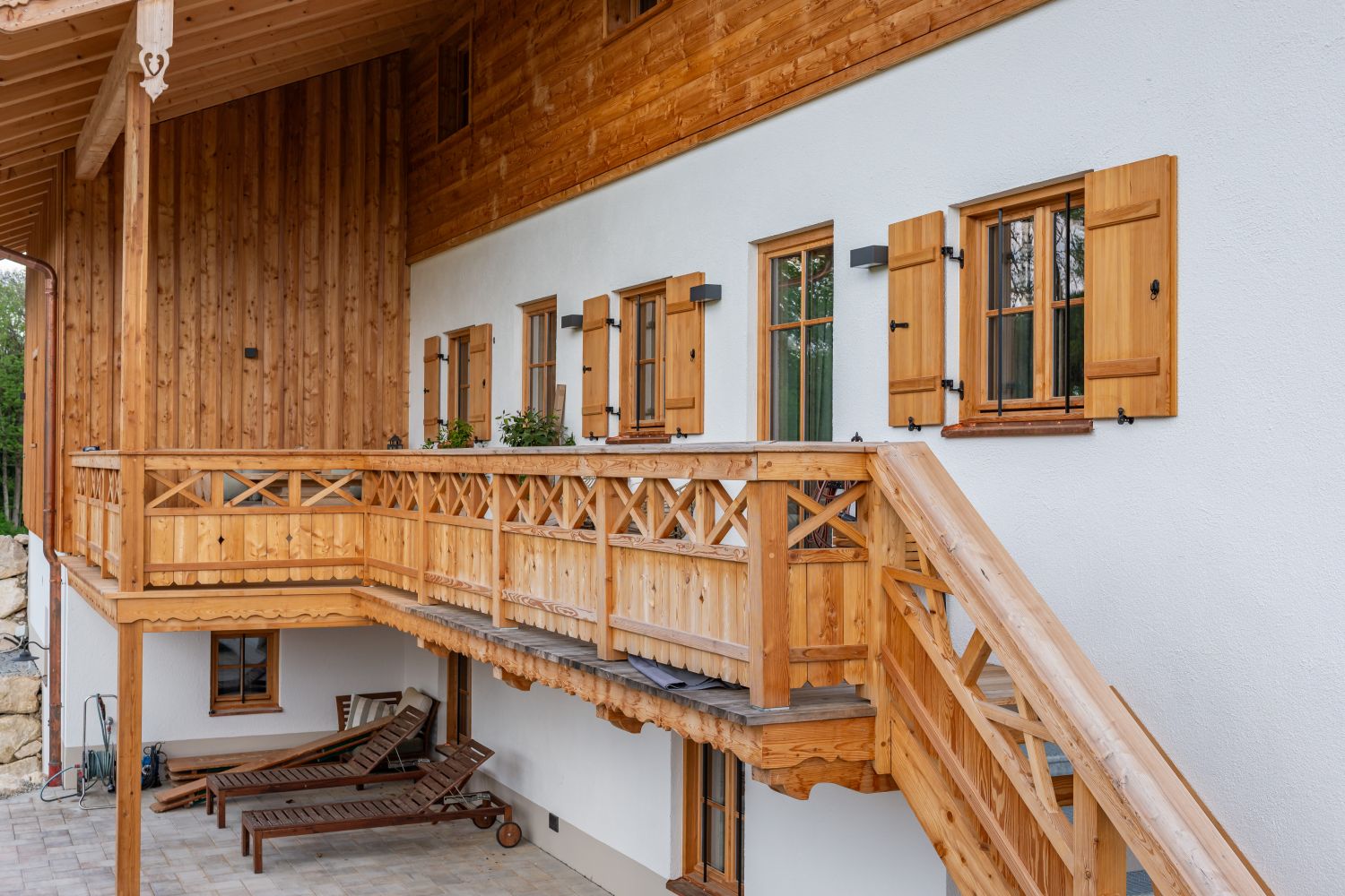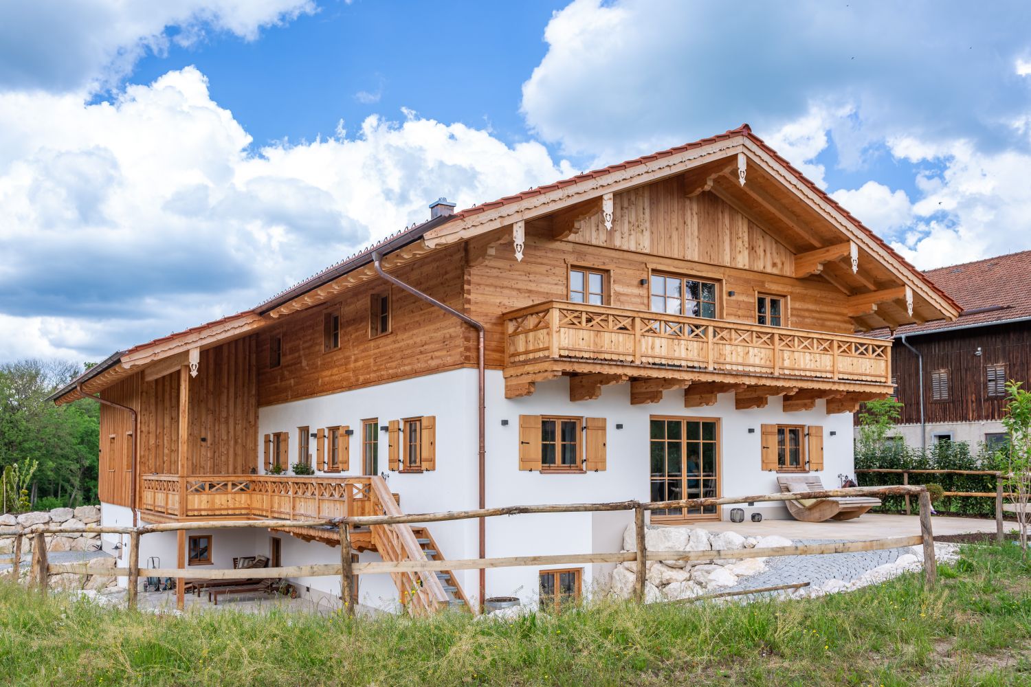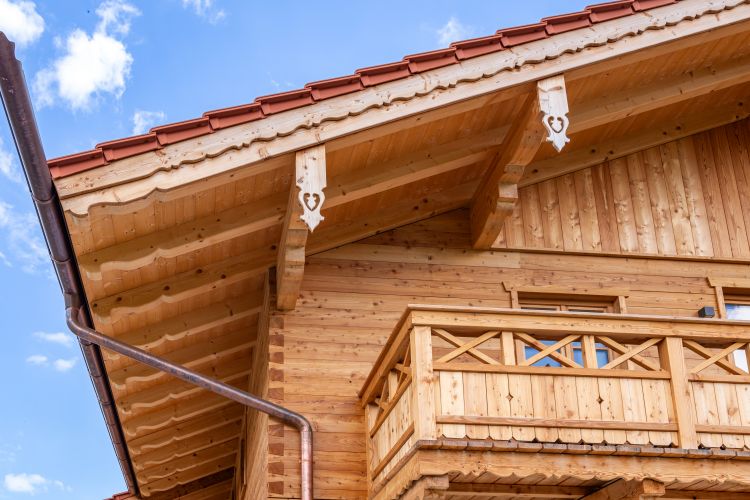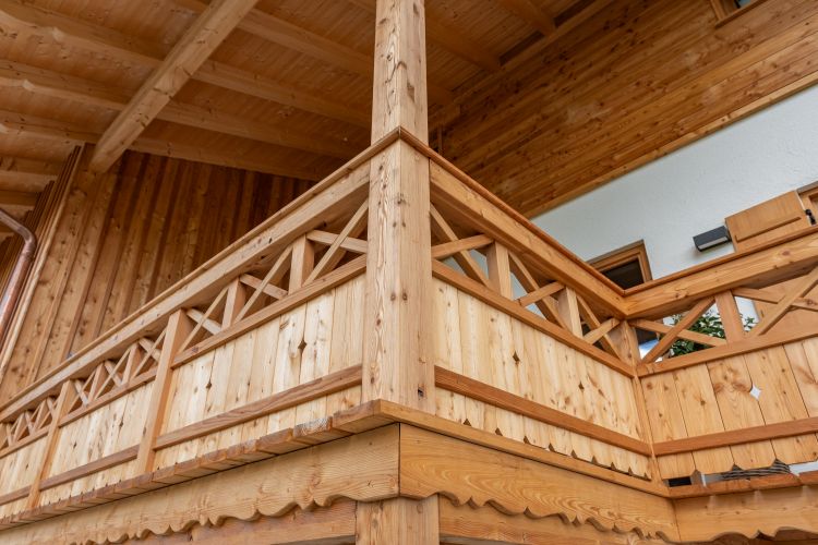 Das Landhaus in Irschenberg beeindruckt mit einem aufwändigen Dachstuhl, geschnitzten Pfettenbrettern und einer liegenden Blockwandschalung in Lärche mit Tiroler Eck-Ausbildung. Der Balkon ist mit zwei verschiedenen Mustern gestaltet und rundet das Gesamtbild harmonisch ab. Alles ist in Lärche ausgeführt.